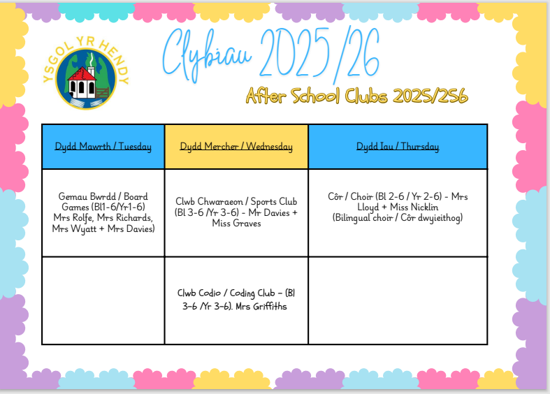 Cysylltwch â’r ysgol am amserlen gyda dyddiau/amserau penodol a gwybodaeth am oedran y clybiau hyn.